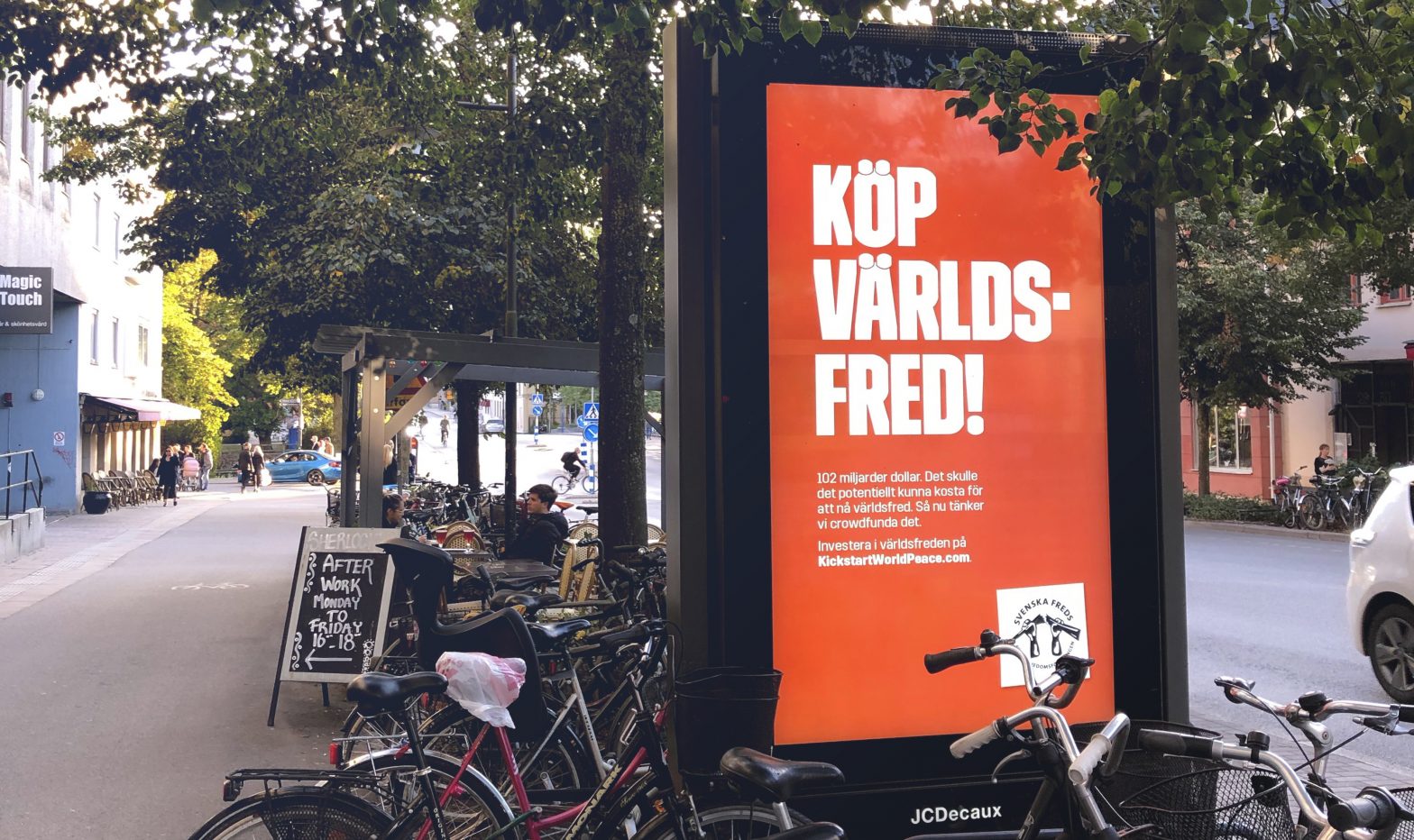 På internationella fredsdagen 21 september drog riksorganisationen Svenska Freds igång en crowdfundingkampanj i samarbete med JCDecaux för att kickstarta världsfreden. 102 miljarder dollar är vad som potentiellt behövs. Nu har människor världen över möjlighet att ta ställning, sätta press på makthavare och bli medgrundare till världsfred.